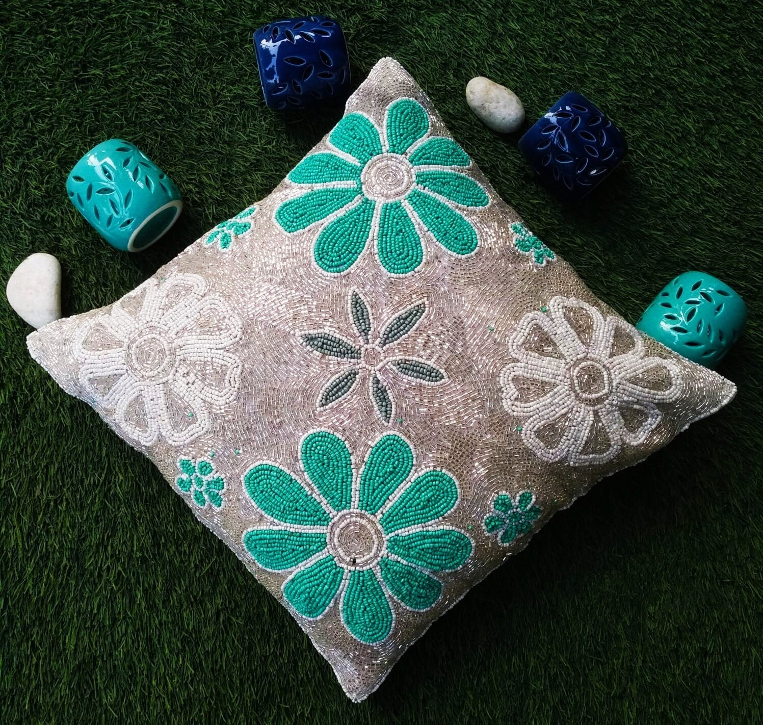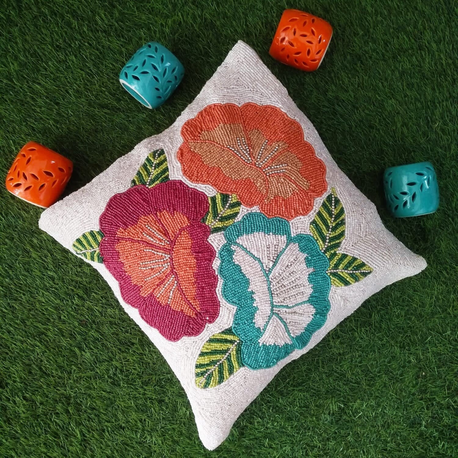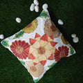 🌼 Beaded Flower Embroidered Cushion Cover – 16" x 16" – Handcrafted Home Decor