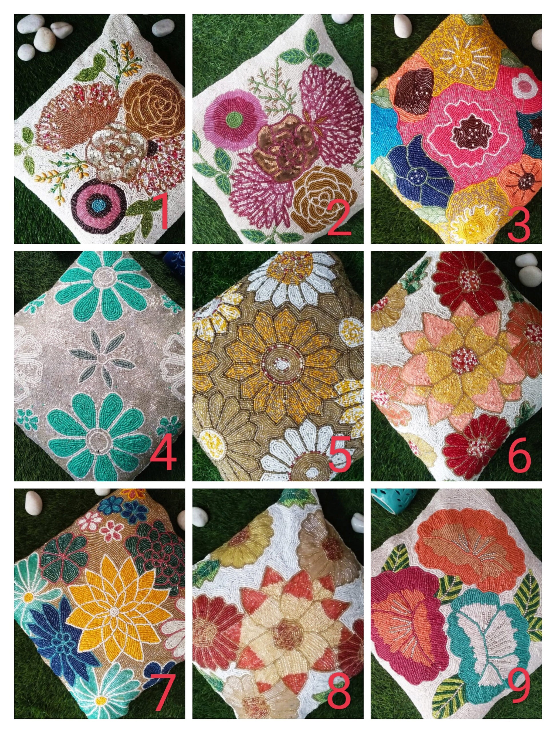 Add a touch of elegance and charm to your space with this hand-embroidered beaded flower cushion cover. Expertly crafted with intricate beadwork and embroidery, this decorative pillow cover is a beautiful statement piece for your living room, bedroom, or seasonal decor.